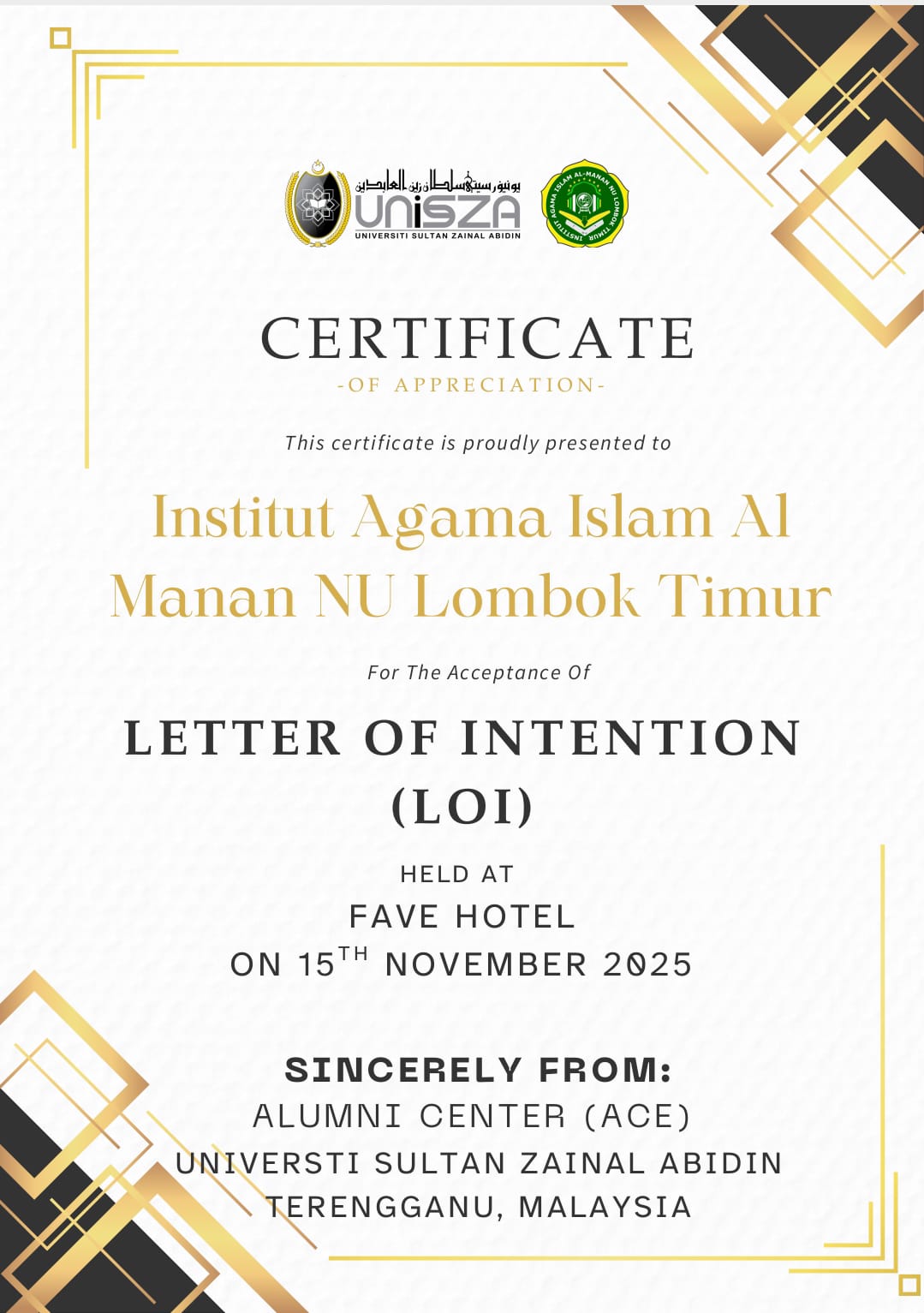 Beranda Kerjasama Luar Negeri Kerjasama Luar Negeri Letter Of Intention (LOI) antara Institut Agama Islam Al-Manan NU Lombok Timur dengan Universitas Sultan Zainal Abidin (UNISZA) Terengganu Malaysia Facebook Twitter WhatsApp Pinterest